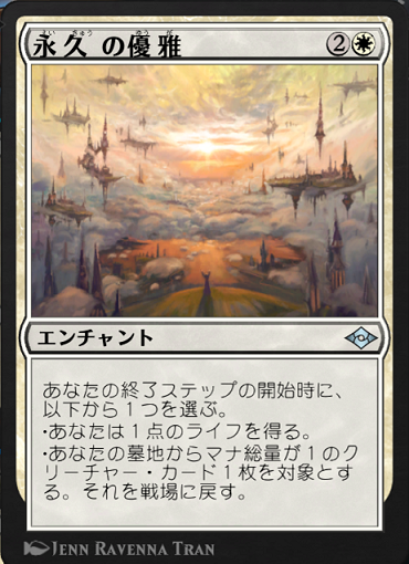 今回の注目カードは、白1無色2のエンチャント『永久の優雅』。名前にふさわしくなく永続的な効果はとても便利です。白なのにリアニ前提というのが、何というか。。