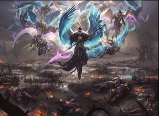 暁の天使:[4白] 3/3 飛行、戦場に出たときターン終了時までコントロールしているクリーチャーは+1/+1,警戒を得る。