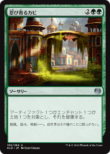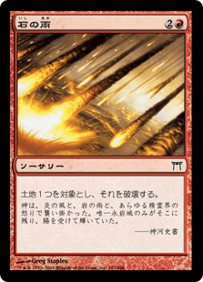 こいつは人間じゃないから変容できるじゃん、というのが今回のコンボの出発点だ。手札を捨ててカードを引く→戦慄衆の秘技術師を出す→変容して殴る、といった流れでランデスを行なっていく。「鋸牙の破砕獣」のおかげで6/6になった「戦慄衆の秘儀術師」の能力で「石の雨」「地震断層」「忍び寄るカビ」などを唱えていく。
