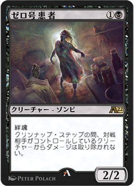 対戦相手のクリーチャーが受けたダメージは「ゼロ号患者」によって蓄積ダメージになる。「損魂の魔道士」みたいなカードだが、戦闘ダメージも蓄積するのが魅力だ。