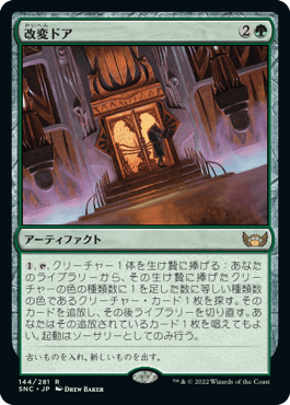 アーティファクト=無色クリーチャー群であることを利用すると、単色クリーチャー探し放題な一枚になる「改変ドア」は実は意外と広範囲のカードを探し出せる。どんなコンボデッキでもパーツを探す手段はとても重要になる。